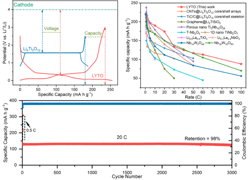 作為鋰電負極,鈦酸釔鋰的平均工作電壓為0.3Vvs.Li+/Li,可逆比容量達到230mAhg-1,更低的工作電壓和更高的比容量使得鈦酸釔鋰電池能量密度數倍于鈦酸鋰電池。此外,鈦酸釔鋰具有出色的倍率性能和循環穩定性,其倍率比容量超過了大多數已報道的鈦基負極材料,在20C(1C=200mAg-1)下循環3000次后容量保持率高達98%。