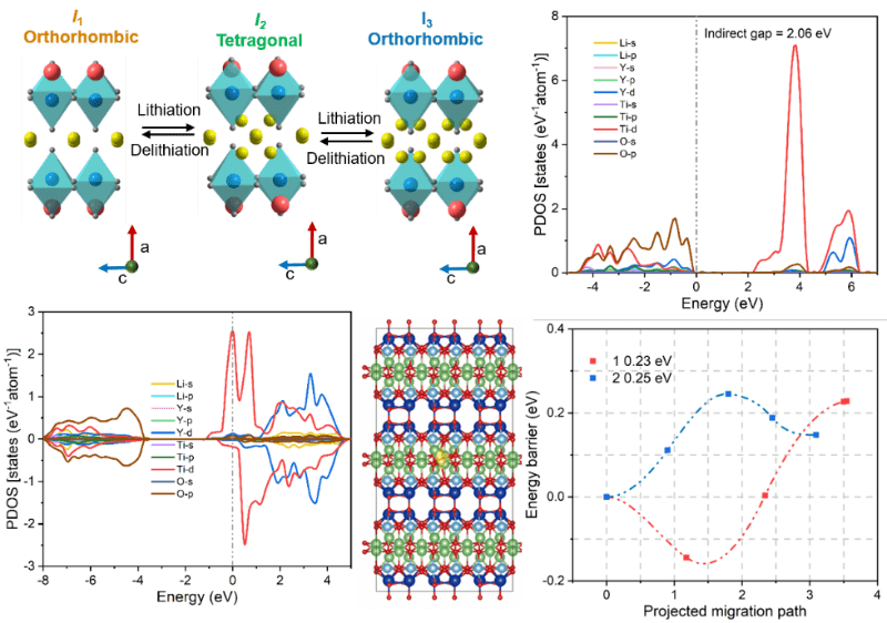 利用一系列的表征和第一性原理計算,本工作還詳細探究了該類材料的儲鋰機理(圖3)。鈦酸釔鋰在鋰離子嵌入/脫嵌過程中會發生可逆的三階段固溶轉變,鋰離子可沿鈦酸釔鋰中的二維通道快速遷移,這一過程伴隨著微小的體積變化。
