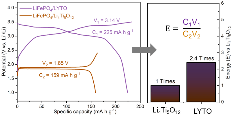 另外,在匹配磷酸鐵鋰(LiFePO4)正極后,鈦酸釔鋰全電池的能量密度為磷酸鐵鋰/鈦酸鋰全電池的2.4倍(圖4),進一步表明鈦酸釔鋰作為低電壓、高倍率負極材料的潛在應用價值。